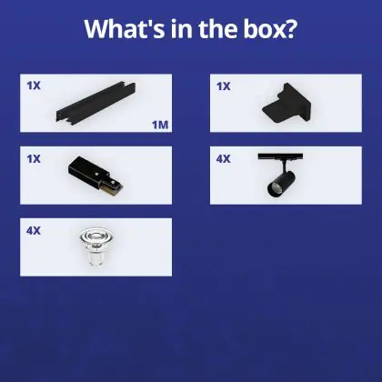 Beschreibung Komplettset 1-Phasen Rail 1 Meter Schwarz | incl. 4x Spot + GU10 2700K 3W Dimmbar + Abschlusskappe, Stromanschluss