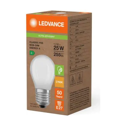 Die Ledvance LED Classic E27 Birne Fadenlampe Matt 1.2W 255lm - 827 Extra Warmweiß | Ersatz Für 25W ist eine effiziente E27 LED-Lampe mit Retrodesign und der perfekte Ersatz für Ihre konventionellen 25W Lampen mit E27. Zudem strahlt sie Licht in der Farbtemperatur 2700K - Extra Warmweiß aus und punktet durch eine lange Lebensdauer.