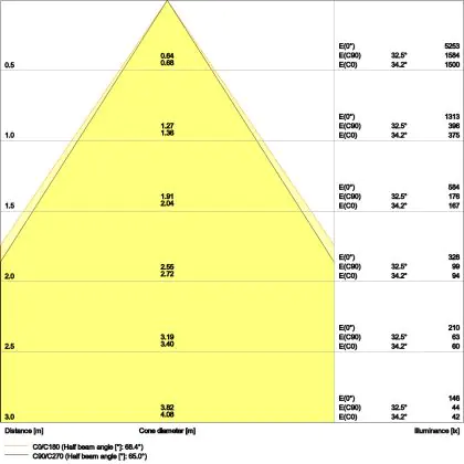 Beispiel: Wird eine Lampe mit einem Abstrahlwinkel von 60 Grad an der Decke (2,5 m Höhe) angebracht, erzeugt sie einen Lichtkegel von 2,9 Metern Durchmesser. Hat die Lampe hingegen einen Abstrahlwinkel von 120 Grad, beträgt der Lichtkegel 8,7 Meter im Durchmesser. |