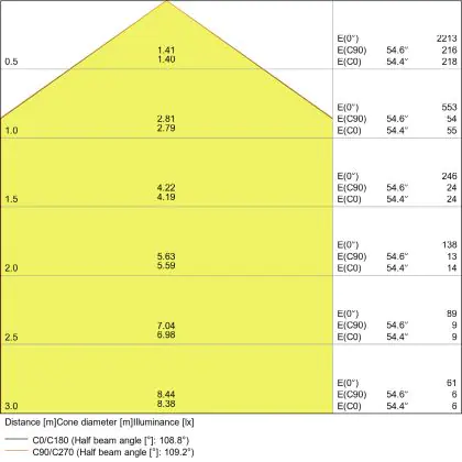Beispiel: Wird eine Lampe mit einem Abstrahlwinkel von 60 Grad an der Decke (2,5 m Höhe) angebracht, erzeugt sie einen Lichtkegel von 2,9 Metern Durchmesser. Hat die Lampe hingegen einen Abstrahlwinkel von 120 Grad, beträgt der Lichtkegel 8,7 Meter im Durchmesser. |