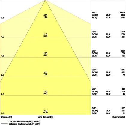 Beispiel: Wird eine Lampe mit einem Abstrahlwinkel von 60 Grad an der Decke (2,5 m Höhe) angebracht, erzeugt sie einen Lichtkegel von 2,9 Metern Durchmesser. Hat die Lampe hingegen einen Abstrahlwinkel von 120 Grad, beträgt der Lichtkegel 8,7 Meter im Durchmesser. |
