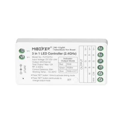 Der MiLight / MiBoxer LED Controller 3in1 (FUT037S+) ist eine vielseitige Steuerungslösung für mehrfarbige LED-Streifen mit gemeinsamen Kathodenanschluss. Er unterstützt RGB (4-polig), RGBW (5-polig) und RGBWW/RGBCCT (6-polig) und ist mit allen MiBoxer / Mi-Light Fernbedienungen kompatibel.